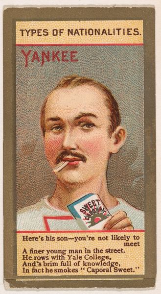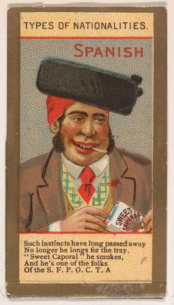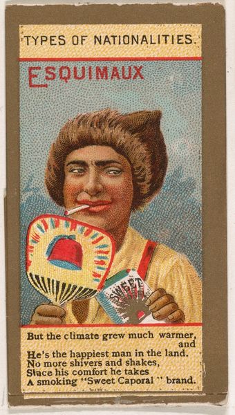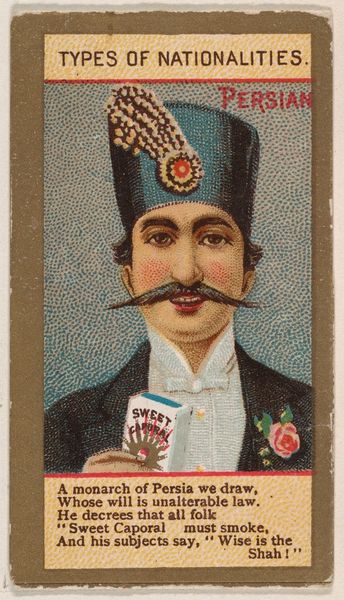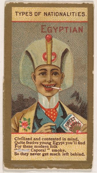 Editor: So, here we have "Fiji, from Types of Nationalities" printed around 1890 by Kinney Bros. It appears to be a print, probably a chromolithograph, made as a tobacco card. I'm struck by the caricature – how do you interpret this work from a formal perspective? Curator: Formally, the piece presents a curious tension. Observe the meticulous detail given to the textures – the turban, for instance, and the stylized patterns in the background. This contrasts sharply with the exaggeration of the facial features and the somewhat crude linework around the eyes and mouth. How do these contrasting visual elements work together to create meaning? Editor: I guess it's this juxtaposition of the refined technique with the caricature style that is striking. It does seem deliberate. Curator: Precisely. Consider also the composition – the figure is centrally positioned, almost like an icon. Yet the inclusion of the text beneath undermines this sense of solemnity. How does this positioning and inclusion of text affect the viewer's interpretation? Editor: The poem and the cigarette box really disrupt the portrait-like qualities, but I see that the repetition of color in the text box is connected to the figure's color scheme. Curator: Indeed, color plays a key role. The muted, earthy tones of the figure are grounded by the vibrant reds and blues. The color choices invite the viewer to consider not just the aesthetic of the piece but its conceptual underpinnings. What relationship can we consider? Editor: Well, now I see how the bright colors make the figure more alive, but it also underscores the artifice, or the performance of a culture in a sense. It's not about true representation but using colors to show cultural characteristics. Curator: An astute observation. By focusing on the interplay of form and content, we begin to see how the artwork operates as a signifier, both reflecting and perpetuating prevailing ideologies of its time. It uses both to give meaning and context to itself.