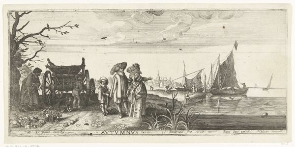 Curator: Here we have Wenceslaus Hollar's etching, "Fable of the farmer and his donkey; Both the farmer and his son are walking," created between 1627 and 1628. It is now part of the Rijksmuseum collection. Editor: What strikes me immediately is the composition—the stark division of figures set against the open landscape, water, and sky. It's like two separate acts are being performed on a single stage, each vying for the audience's attention. Curator: Precisely. Hollar, working in the Baroque style, used the print medium to disseminate moralizing tales to a growing public. This work taps into the broader early modern anxiety about social roles and the absurd expectations of public opinion. Editor: I am captivated by the donkey itself, positioned centrally. Donkeys often symbolize stubbornness or foolishness. The fact that neither the father nor son ride it amplifies this; it represents a failure of pragmatism, doesn't it? Curator: Yes, and that symbolism is reinforced by the jeering figures on the right, standing away from the others. The imagery here is deployed as social commentary. The people become both the subject of observation and observers themselves. Editor: I am fascinated with that duality – how this scene echoes across time. The pier in the background makes the image timeless – it looks just like many docks in small coastal towns around the world, and therefore creates a bond with us that we don't even expect. The donkey and family unit walk, as ships go out to the sea and windmills spin and smoke from village dwellings carries in the distance – the full cycle of human living. The emotional resonance still rings true today. Curator: Indeed. Looking at Hollar's historical and political context, printmaking enabled wide access to imagery and was deployed during periods of religious and social upheaval, this parable encourages questioning. Editor: Thinking about the fable, I see how this engraving goes beyond simple moralizing. The image offers a commentary about what it is to feel observed. I am walking away thinking, perhaps they walk as to challenge any potential observers on what to do, or how to judge. Curator: Absolutely. It becomes a timeless examination of human folly and the challenges of navigating social expectations, something still extremely poignant centuries after its creation.