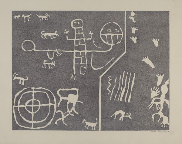 Curator: Emerson Woelffer created this abstract monoprint, called "Double 'O'", back in 1953. Look at the sharp lines! Editor: Immediately, I sense a playful energy. It's chaotic, yet there's a structure struggling to emerge. The composition almost feels like it's teetering on the edge of collapse. Curator: The “double O” indeed dominates, doesn’t it? Considering woelffer’s interest in surrealism and Abstract Expressionism, are we looking at an allusion to the self? Two eyes staring outward, perhaps? The overlaid lines suggesting an inner turmoil? Editor: Possibly. But knowing Abstract Expressionism, it could also just be about the sheer physicality of the materials. How the ink moves and bleeds. Look at the lower register where lines transform into near illegible scribbles that make one work to find a legible reading of the whole artwork. Curator: Legibility is part of the trick. The symbols seem ancient, echoing forgotten alphabets and primitive human expression. Is Woelffer channeling some archetypal force here? Editor: Or maybe reflecting on the breakdown of language and communication in a post-war world. Remember, this was created in 1953. The optimism of the early century has been shattered, the certainty of meaning has begun to collapse. Perhaps the deconstructed language mirrors that collapse of certainty. Curator: That could resonate. It feels stark, perhaps almost a rejection of established order. Yet, in these deconstructed shapes, could there be an emerging new symbolic language trying to take hold? The pair of eyes standing guard or leading forward into a space of newly discovered forms and structures of representation? Editor: It's an excellent question, and speaks to the tension present within Abstract Expressionism, this search for new forms with the awareness that the past has shattered the traditional basis of art. So the challenge remains of finding relevant ways of addressing viewers. Curator: "Double 'O'" serves as a powerful document of mid-century existential anxieties. Editor: ...and it invites us to consider our place within them.