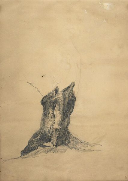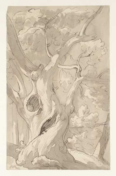 Curator: This detailed pen and ink drawing, created by Richard Nicolaüs Roland Holst between 1878 and 1938, is titled "Dikke boomstam," meaning "Thick Tree Trunk." It’s rendered on paper. Editor: The texture is extraordinary. The stippling makes the tree's bark seem almost…ancient, weathered by countless seasons. I imagine it looming over a very old landscape. Curator: Holst’s work often explored the symbolic weight of nature, and the tree as an image is practically overflowing with connotations. For many cultures, it represents life, growth, connection, and ancestry. Editor: Absolutely. It's as though Holst is capturing not just a tree, but the very idea of a tree – a sort of ur-tree, solid and resilient. The intricate detailing suggests painstaking observation but it’s clearly loaded with symbolic power, going back to those pre-Christian "sacred groves." Curator: Right, and notice the deliberate lack of any contextual setting. This isolates the trunk, emphasizing its solidity and timelessness, perhaps inviting the viewer to reflect on the enduring strength of the natural world. This technique makes us reflect about its placement within the tradition of Dutch landscape drawings and how trees played such a symbolic role throughout landscape painting tradition Editor: And there's something almost confrontational in its presence, looming so large in the composition. It demands our attention, makes us consider our own fragility compared to the tree’s enduring nature. How do you think his contemporary audiences received such work, and in what kind of cultural environments were they appreciated? Curator: Interesting. During that period, there was a rising trend that looked to the natural world as an antidote to the fast industrializing societies and cityscapes. Images of rootedness in the soil represented a need to feel grounded and more authentic in our own identities. The drawing almost visualizes cultural memories in itself. Editor: I hadn’t quite thought of the artwork as a mirror to cultural anxiety. I had primarily perceived its compositional strengths and that sense of imposing longevity. Considering this drawing from its broader cultural and social implications certainly shifts our understanding of both the tree and ourselves in it. Curator: Yes. By studying seemingly straightforward depictions like this drawing, we begin to unpack larger meanings behind our human need to define our cultural and existential questions through tangible imageries and representation.