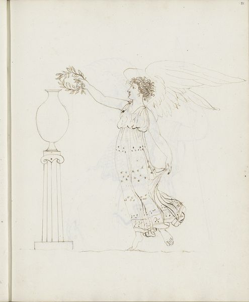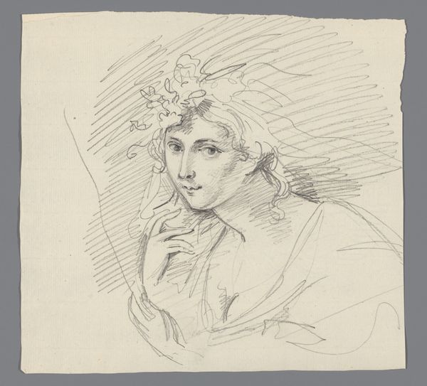 Editor: So this is “Vrouw met een lauwerkrans en korenaren in het haar”—which translates to “Woman with a laurel wreath and ears of corn in her hair.” It's a pen and ink drawing from between 1816 and 1852. The profile seems very serene, almost goddess-like. How do you interpret the symbols present here? Curator: The laurel and corn aren't merely decorative; they're potent symbols echoing throughout history. Laurels, think of Apollo, victory, achievement; and corn, deeply rooted in cycles of life, fertility, and prosperity. Look how they’re interwoven – what emotions does that pairing evoke for you? Editor: I see them as representative of both intellectual achievement and worldly success, which create an interesting combination. What’s the impact of combining these classical motifs within the context of the 19th century? Curator: Precisely! In the 19th century, these classical symbols offered a connection to a glorious past. They reflect an idealized vision, a visual vocabulary accessible and resonant for the educated viewer. This image isn't just a portrait, it’s a statement about aspirations and values in a changing world. Does knowing that impact how you feel about the piece? Editor: Yes, definitely. It makes it feel like more than just a pretty picture; it’s an active engagement with history. Curator: Indeed! This is cultural memory made visible. Editor: I learned so much about how artists engage with cultural history through symbolism. Curator: And I’m reminded how vital these connections remain for viewers today.