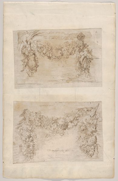 Curator: Giovanni Battista Merano's "The Holy Spirit Surrounded by a Wreath of Flowers Held up by Infant Angels," likely created between 1632 and 1698, is a drawing rendered in ink on paper. The artwork is part of the collection at the Metropolitan Museum of Art. Editor: My immediate impression is that it’s so airy and delicate! There's an incredible lightness achieved despite the traditional religious subject. The wispy lines give it a fleeting, dreamlike quality. Curator: Indeed. Let us consider the formal composition: notice the circular arrangement of the floral wreath and the cherubic figures. The artist guides our gaze in a continuous loop, almost like a symbolic representation of eternity, anchoring the dove, which of course signifies the Holy Spirit, within its structure. The ink wash emphasizes the play of light and shadow, creating volume. Editor: It's interesting to situate this within its socio-political context, right? Baroque art was often used by the Catholic Church to reaffirm its authority during the Counter-Reformation. How might Merano be using this traditional religious symbolism – angels, doves, floral wreaths – to negotiate evolving ideas around power, religion, and the human form during that era? And is there something implicitly problematic, in a historical sense, in idealizing chubby, white male infants as purely "holy"? Curator: I appreciate your points, but I'm more drawn to how Merano used his medium, this understated ink, to subtly and devoutly enhance a deeper spiritual contemplation on faith and its rewards. There are even underdrawings beneath this sketch that emphasize Merano's attention to composition. I see an almost mathematically structured representation, a baroque ode to the sublime. Editor: Perhaps, but its worth noting that the figures are quite eroticized when observing them through the lens of contemporary, intersectional, gender theory. In that view, is Merano asking the viewer to question issues of divine versus human pleasure, through these barely-veiled depictions? I also have to wonder, given art history's record of erasing women's contributions, if women participated at all, even peripherally, in the concept or creation of this devotional image. Curator: We could delve into all the theory behind this for ages, but for me, it will always be about form, medium, composition, and how all three work together in Merano's drawing, ink on paper. This work achieves an incredible sense of spiritual transcendence through purely artistic choices. Editor: Agreed. Seeing this piece through many lenses is really enlightening. For some, it may offer solace and an embrace of their traditional faith. Others might find themselves contemplating historical social forces or even asking questions about what still resonates, or what should not, about these established forms of belief.