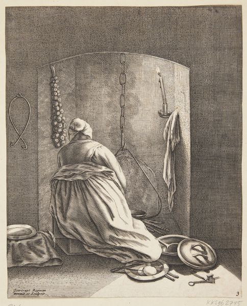Geertruydt Roghman etched "A Woman Cooking" in the mid-17th century, a plate from her series on feminine occupations. At first glance, a simple domestic scene, but observe the details: the hanging sausages and cooking implements, symbols of sustenance and daily life. The hearth itself is an ancient symbol of home and nourishment, and the presence of a lit candle suggests both domesticity and hidden alchemical processes. These are a connection to the sacred fire of Vesta, the Roman goddess of the hearth, whose flame was a symbol of the state and family. This archetype of woman and hearth has shifted over time, seen in Paleolithic fertility figures, and later, the Madonna. Across cultures, these evoke a sense of primal comfort, of being cared for. Yet the turned back and hunched posture of Roghman's cook suggests a weight, a burden—perhaps the unspoken emotional toil of domestic life, an echo resonating through centuries. As such, the image serves as a cyclical return to the earliest representations of our collective consciousness.