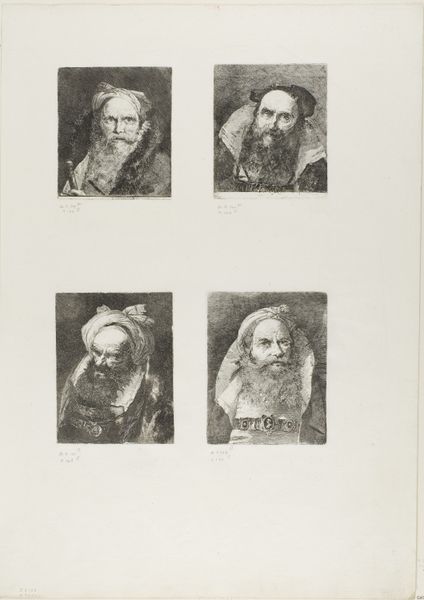 Giovanni Domenico Tiepolo created these four studies of an Old Man with a Beard, using etching, likely sometime in the second half of the 18th century, a period defined by shifting social structures. Tiepolo’s decision to represent older men, specifically, speaks to the dynamics of aging and identity in 18th-century society. While some portraits of the era idealized the sitter, Tiepolo's etchings focus on the realities of aging. The lines etched into their faces hint at the narratives etched by time, suggesting experiences that have shaped their identities. Are these studies of a single person or many? How might these images speak to contemporary ideas about masculinity? Consider the emotional depth conveyed through the artist's skillful use of line and shadow. The choice to focus on older men may reflect a deeper commentary on the value of experience and wisdom. Each face invites contemplation, revealing the beauty inherent in the aging process.