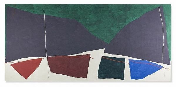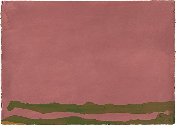 Curator: This is Raoul De Keyser's "Clos" from 2003, realized with acrylic paint and watercolors. What are your initial impressions? Editor: Stark and deceptively simple. There's a kind of casual precision here that creates a mood. The rough, slightly irregular shapes float in a way that feels balanced but off-kilter at the same time. Curator: Exactly! Notice how the spatial relationships create tension, activating the canvas. De Keyser focuses intently on pictorial structure. He orchestrates the flat planes of color to invoke semiotic readings and multiple possible spatial interpretations. Editor: I'm more drawn to the materials. It's interesting that he chose to combine acrylic paint and watercolors. Acrylic creates flat opacity, but watercolors give transparency. Looking at how De Keyser built up the grounds, they don't look entirely flat—do you see evidence of sanding or scraping, and other tactile maneuvers? Curator: Interesting that you bring up process, as surface tension is the prime quality here. This work uses formal reduction. Shapes become signs stripped to the most elemental forms; notice their seemingly arbitrary arrangement. The overall pictorial logic echoes back to his exploration of modernist structure. Editor: But the handmade quality subverts that impulse toward pure formalism. It doesn't quite transcend the act of making—you can see the touch of the artist. This draws me into De Keyser's studio—what kind of tools he might have used, how many layers, his gestures with his hands… How are the materials themselves generating meaning here, not just form? Curator: That's one approach, certainly. I remain compelled by how this composition evokes the tradition of abstract painting, referencing luminaries like Malevich and Rothko but in its own quiet and thoughtful way. Editor: I think what draws me back to it is its subtlety, its refusal to shout. Considering all of its making—materials and gesture, not only its composition—that modesty is its triumph. Curator: An evocative point of view! This piece invites extended visual meditation on fundamental artistic gestures, like the creation of surface and line.