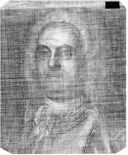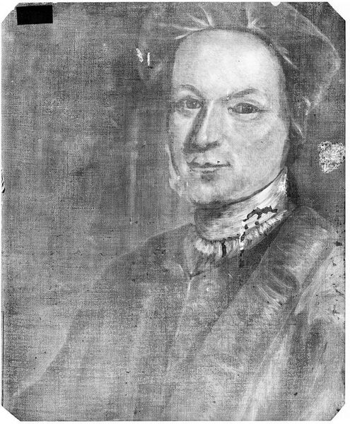 Curator: Here, we have an X-radiograph of John Singleton Copley's "Jane Brown," currently held at the Harvard Art Museums. The film measures 14 by 17 inches. Editor: It's a ghostly portrait, almost like a photographic negative, stripping away the color and leaving only the structure. Curator: Exactly. The radiograph allows us to examine Copley’s process, the underlying layers of paint, and how he built up the composition. It reveals the materiality hidden beneath the surface. Editor: It's fascinating to consider how this radiographic view recontextualizes the portrait. It moves beyond a mere representation of status and reveals the artist’s labor, the very act of creation. Curator: Indeed, this process makes visible the labor typically invisible in art history, inviting us to consider Copley's methods, his revisions, and the very making of the image. Editor: It brings into question the traditional role of museums in preserving and interpreting art; this radiograph offers a very different kind of preservation, doesn't it? A preservation of process. Curator: Precisely, offering a new lens through which we might consider the social contexts of artistic creation. Editor: It certainly shifts our focus away from the sitter and towards the hands that crafted her image.