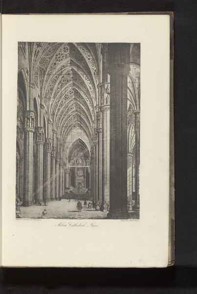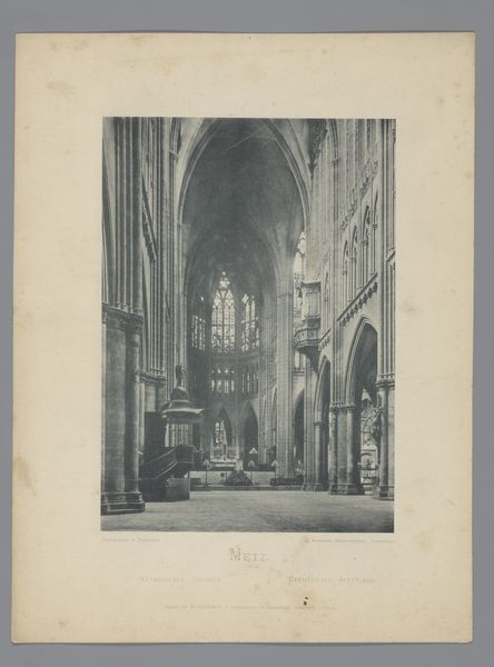 Curator: Immediately striking is the perspective—almost swallowed by the vaulted ceilings! Editor: Here we see Neurdein Frères’ “Interior of the Saint-Étienne Church in Beauvais, with a view of the Choir,” a gelatin silver print likely made between 1875 and 1900. What does that perspective achieve for you? Curator: The convergence of lines draws the eye relentlessly to the altar. It’s a powerful display of scale, isn’t it? A rather grand, albeit sepia-toned, religious experience is conveyed through these gradations. I think the emphasis is on how our positionality as viewers defines the impact of sacred spaces. Editor: Precisely! Look closer. Notice how the photographic process itself—the specific chemistry and darkroom techniques—helped shape the image's reception and mass consumption. Early photography made places such as the Saint-Étienne Church newly available for the rising middle classes in Europe who may have otherwise lacked access. This technology became both a means of production, a site of leisure, and even status symbol. Curator: Certainly the mechanics enabled that expanded access. The subtle variations in light across the stone and wood are marvelous though, aren’t they? How light models the ornamentation…the gothic tracery against solid material... Editor: Well, beyond pure appreciation, the repetitive forms indicate standardized labor involved in reproducing architectural photography and making these faraway destinations tangible to a broader audience through the development and commodification of affordable photography. How are workers impacted, and in turn influencing how viewers perceive these cultural institutions. Curator: Perhaps we can see the convergence of mass appeal and timelessness in this image, after all. Editor: Ultimately it presents questions rather than concrete conclusions about social conditions and production processes in relation to visual perception.