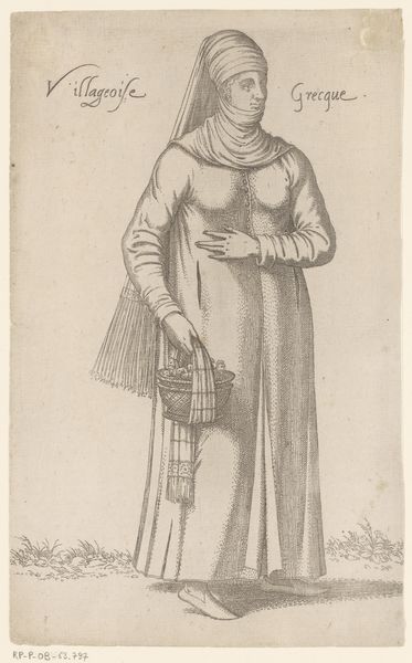 Editor: We're looking at Wenceslaus Hollar's "Mulier Persiana," a detailed engraving. The woman depicted is quite elegant, with elaborate draping and headdress, but there is a formality to the lines, which almost makes her seem distant and untouchable. How do you interpret the aesthetic choices? Curator: Formally, this print operates on a series of contrasts. Consider the texture, achieved through a delicate hatching technique. The smooth expanses of her robe meet the densely worked areas of shadow, creating a push and pull that enlivens the surface. The line itself becomes a subject, doesn't it? Observe its varying weight and direction to delineate form and shadow. It appears that light becomes an important structural tool here. What do you make of the relationship between the figure and the surrounding blank space? Editor: It's interesting you mention the blank space. I see now how the stark contrast heightens the woman's figure; it directs the eye immediately to the detailed attire. It feels like the negative space adds to the overall feeling of formality. Curator: Precisely! The deliberate contrast further isolates the subject, underscoring the intention. The geometric frame that supports her is very clever and intentional. And consider, too, the implied lines of sight. Our subject's gaze directs us not only towards the planes in the blank area of the composition but also creates tension between surface and depth, two-dimensionality and three-dimensionality, that contribute to its undeniable Baroque energy. Editor: That’s insightful. I initially focused on the overall mood and details of the figure, but analyzing the formal structure really opens up another dimension of the artwork, revealing careful thought regarding how we see the subject. Curator: Exactly. A close analysis of its visual elements teaches us so much. It offers an appreciation for its nuanced composition beyond subject matter alone.