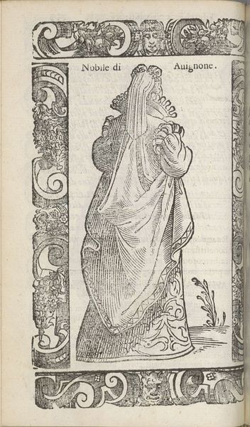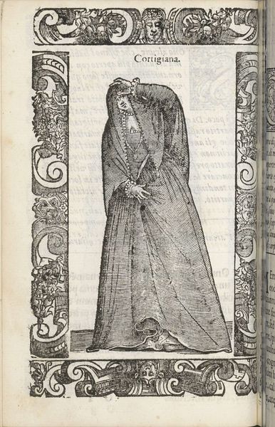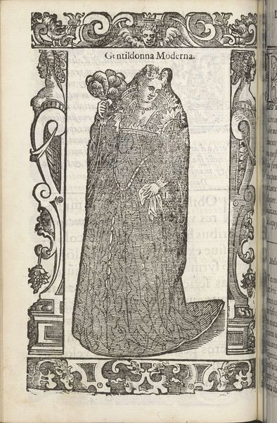Editor: Here we have "Barones uit Napels," or "Baroness from Naples," an engraving from 1598 by Christoph Krieger. It depicts a woman in elaborate clothing, complete with a fan, surrounded by an ornate border. The woman's identity is not apparent and only that her status is connected to Naples. How should we interpret her representation, and her presence in the broader history? Curator: This print offers us a fascinating glimpse into the performance of power and identity in the late 16th century. Consider the very act of creating and disseminating this image. Who was it made for? What social and political functions did such portraits serve? I mean, the clothing alone speaks volumes. It is meant to create hierarchy. What does it do? Editor: So, the very detail in the woman's dress communicates this societal positioning? It's such a clear marker of status. And also makes me wonder whether or not she really has the agency one might expect in contemporary times. Curator: Exactly. And thinking about her agency, or lack thereof, within a patriarchal system is crucial. Does the image serve to celebrate female power or to reinforce existing hierarchies? It is essential to consider gender as a category of analysis and ask how women were both empowered and constrained by their social roles. It's the same today! It really hasn't changed much, huh? Editor: You've definitely opened my eyes to a new way of seeing portraits! It's like each detail is a piece of a bigger social puzzle. I hadn't really stopped to think about these historical undercurrents when it came to this one engraving. Curator: Glad to hear it.