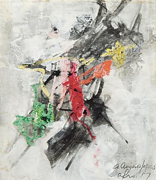 Afro made this painting, called Composition, in 1957, using oil paint. What I notice right away is how Afro lets the energy of his marks dictate the piece. It’s all about the doing, the moving around of the paint, the scraping, the layering. The colors here are really working for me. The way the white and gray almost cancel each other out, creating this hazy ground for the deep red and bold black to pop. Look at how the red isn’t just one flat tone; there are flecks of white peeking through, giving it this incredible texture. The black lines feel urgent, like they’re holding everything together, but also pushing it apart. It makes me think of Cy Twombly, but with a tighter, more contained energy. You get the sense that Afro is really wrestling with the materials, letting the paint itself lead the way. It's this push and pull, this conversation between control and chance, that makes painting so alive.