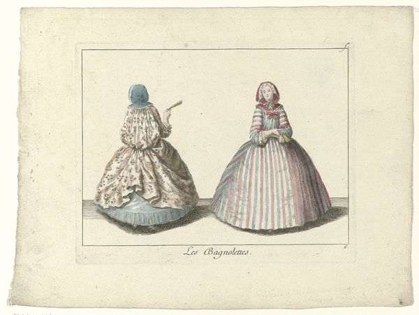 This is an engraving by Antoine Hérisset, depicting fashionable dress. It's a visual compendium of status, announcing itself through the opulent display of fabrics and forms. Observe the cane, a seemingly simple prop in the ensemble of the 'Habit Ordinaire.' Beyond mere support, the cane has a rich history, evolving from a symbol of pilgrimage and guidance to a scepter-like emblem of authority. Think of Hermes's caduceus, a symbol of medicine, and its connection to the guiding staff. In this print, the cane, though secularized, still carries echoes of that primal association with direction and control. Consider how this symbol reemerges centuries later: it speaks of evolution, adaptation, and the enduring human need to project power through symbolic objects. This image is not just a record of fashion but a testament to the silent language of symbols. The play between visibility and concealment is a recurring theme, inviting us to ponder the hidden meanings behind sartorial choices.