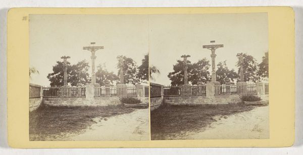 Curator: Before us, we have a gelatin-silver print from sometime between 1860 and 1885 by Pieter Oosterhuis entitled "Gezicht op gesticht Meerenberg in Bloemendaal", depicting the Meerenberg asylum. It's a fascinating example of early architectural photography. Editor: The composition immediately strikes me. That picket fence dominating the foreground feels like a deliberate barrier, creating a sense of separation from the building beyond. What effect do you think that has? Curator: I think it speaks to the way such institutions were perceived then—as places set apart, both physically and socially. There’s a symbolic containment present. Mental illness, then, carried a profound stigma, and architecture reinforced this. The asylum appears solid, imposing, yet strangely impersonal. Editor: Indeed, the building's façade, while regular in its windows, lacks warmth. The lack of direct human presence in the image contributes to this austere feeling. Notice also how the tones tend to monochrome shades, almost draining all vitality. Curator: Oosterhuis, being a Realist, probably aimed for documentary objectivity, yet the visual choices undoubtedly shaped our experience. Consider how the broken chimney emphasizes time and decay. It subtly foreshadows decline or malfunction. The tall skinny trees contrast with it like silent watchmen or grieving mourners, as if guarding sad secrets. Editor: I see what you mean. And yet the placement of the chimney right of centre guides the viewer’s gaze towards the building, creating a strong focal point and structural symmetry along vertical lines. Did this institution represent a social structure? Curator: Absolutely. Mental asylums had been seen as modern social tools of progress. But also tools of control and confinement, often isolating individuals from society and normal living. The symbolic connotations speak directly to those conflicting meanings. It brings to mind a similar effect in Dorothea Lange’s portraits during the Depression. Editor: In this context, the photograph transforms from a mere document to an emotional, perhaps even critical statement. That's fascinating to me. Thank you for making those visual relationships clear, linking composition to emotional meaning. Curator: It's precisely through studying the convergence of those symbols—social, architectural, psychological—that this image gains enduring meaning beyond its immediate subject. It acts as a portal into understanding a forgotten or deliberately concealed past.