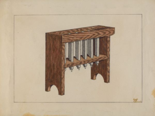 Curator: Well, isn't that... charmingly utilitarian? Looks like something straight out of Grandma's attic. Editor: Precisely. What we have here is Edna C. Rex’s "Foot Warmer," dating back to around 1936. It’s a watercolor and ink drawing. A rather unassuming depiction of domestic life. Curator: Unassuming is one word for it! It’s so… plain. All those evenly spaced dots—it almost looks like a bizarre game of Connect Four gone wrong. I wonder if that's blue ink that went with a kind of wood or painted wood? Editor: The medium certainly informs the mood, doesn't it? There's a gentle fragility to the watercolor, but the ink provides a contrasting sense of order and exactitude. Consider the composition itself—a rigidly symmetrical box perched in the center. The almost clinical rendering demands a deliberate reading. The texture invites close scrutiny: each dot, each line of the woodwork contributes to the object's presence, giving an idea about its original function. Curator: Function, sure, but also a hint of…long winter nights? Of simpler times? Perhaps of someone feeling a chill that never quite goes away, reaching for warmth in a box. You can't deny its rustic, if slightly gloomy, appeal. But does every piece has to shout? Isn’t there a strange kind of minimalist beauty in that? Editor: Minimalism wasn't quite the artist's intent! The object speaks not of grand statements, but of smaller narratives: what makes an object more of an art than a commodity, like how we imbue personal histories to create an echo. But do these faint outlines point to some existential coldness? Curator: Haha, an existential coldness indeed! Well, whatever else, it certainly warmed us to a new perspective. Editor: Agreed. Sometimes it’s the seemingly simple that makes us rethink the real, isn’t it? And perhaps even the chill within us.