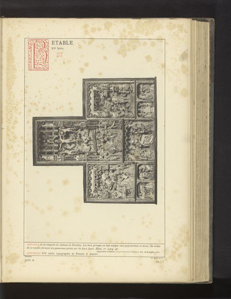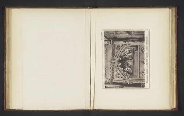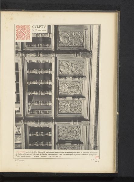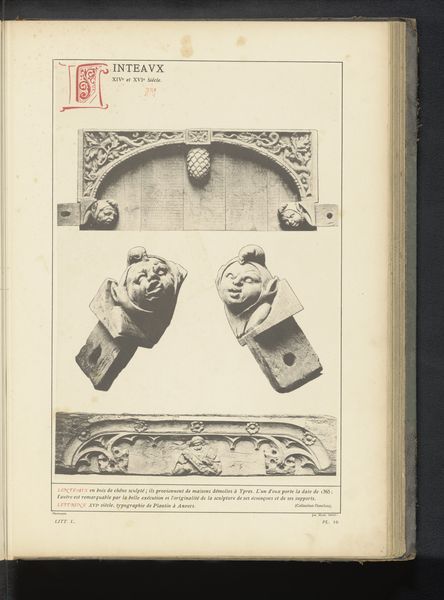 Editor: Here we have what's described as an 'Eikenhouten gedecoreerde deur van een woning te Luik,' or, an 'Oak decorated door of a house in Liege,' created before 1889. It’s quite striking! The carved details seem almost medieval in their style. I wonder, what visual symbols do you find most compelling in this work? Curator: The arrangement and particular focus on symbolism create such a vivid historical atmosphere. Consider the mask-like carving in the center. In architecture, masks are commonly used as apotropaic symbols; meant to ward off evil or protect the home and its inhabitants. The placement at eye level suggests direct engagement with anyone approaching the threshold. What feeling does that elicit? Editor: That's fascinating! It almost feels a little intimidating now, like it's guarding something. Curator: Exactly! Now look at the phrase above – "FONT EAR COMPAS." Given the prominent placement, the saying was intended to be seen, and thus understood. This is what informs the symbolism present in domestic life at this time. Would you describe it as an open welcome, or something else? Editor: Maybe a moral instruction? To “be a source and guide”? Curator: Precisely! That phrase, coupled with the mask, crafts a very particular statement. This threshold isn’t merely an entrance; it's a point of transition into a space governed by particular principles and perhaps…protected by watchful entities. We often overlook how doors can encapsulate not only entrances, but entire cultural belief systems. Editor: That's such an interesting perspective. I hadn't thought about how much cultural weight could be embedded in a single doorway. Thanks! Curator: Indeed. Everyday images from our cultural history can illuminate symbolic patterns, memory and meaning of visual art that’s not always apparent.