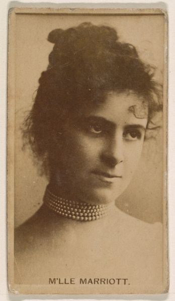 Editor: This is "M'lle Marriott" from the Actresses series, dating back to 1890 by Kinney Brothers Tobacco Company. It's a small albumen print – almost like a vintage trading card. It has a warm, sepia tone and the focus is just razor-sharp on her face. What can you tell me about this piece? Curator: It’s fascinating how objects initially created for mass consumption – like this cigarette card – later transition into museum pieces. The production itself speaks volumes. This was not "high art," but a commercially driven piece using the then-relatively new technologies of photography and print. The albumen process, involving egg whites, gave a unique gloss and sharpness, making the actress seem almost tangible. Think of the laborers involved: photographers, printers, and factory workers packaging these with cigarettes. It all contributes to its cultural significance. Editor: That's so interesting! I had just been focused on the figure in the portrait and its aesthetic value. You're saying the real story is in the making? Curator: Exactly! Consider Kinney Brothers using actresses to promote Sweet Caporal Cigarettes. What did it mean to link these women’s images, their fame, to a product meant for mass consumption? This card embodies a complex interplay of gender, class, and commercialism in the late 19th century. How does its function as advertisement impact your perception? Editor: It completely changes it. I realize that seeing this image detached from its original context in the museum gives me an incomplete understanding. The medium itself becomes the message in a way. Curator: Precisely. Analyzing these mass-produced items offers invaluable insight into the labor and cultural values of the time. It allows us to look beyond simply appreciating aesthetic appeal, and towards deconstructing its historical and material implications. Editor: I see what you mean. Thank you for broadening my perspective!