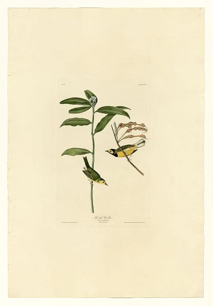 Editor: Here we have John James Audubon’s “Plate 20. Blue-winged Yellow Warbler,” a watercolor and drawing created in plein-air. I am struck by how delicate and precise the lines are. What stands out to you? Curator: Focusing solely on its visual aspects, notice the composition's equilibrium. The placement of the warblers and flowers creates a balanced yet dynamic interplay. Observe how the artist contrasts the sharp detail of the birds with the softer rendering of the foliage. This manipulation of texture and line serves to direct the eye and highlight the subjects. Editor: Yes, I see that. How do you feel about the use of space here? The composition seems to be fighting to remain within the picture plane. Curator: Indeed. The use of negative space contributes significantly. The stark background throws the subjects into sharp relief. It amplifies the intensity of their forms and colors. Do you see any significance in how the birds interact with their environment? Editor: I notice that the yellow in their wings is picked up by the flower centers... It creates a visual echo! I had not noticed that before. It is like a formal conversation between the birds and the plants. Curator: Precisely! It reinforces a sense of visual harmony. It also prompts deeper investigation into their relationship. Color is an inherent tool used to describe depth of field with the intention of cohesion of elements within the piece. Editor: Looking closer now, it seems that Audubon wanted me to really consider the texture, the detail and the geometry. Thank you. Curator: You are most welcome. Remember to study art as a unique set of interacting forms. Visual components have more value than simply cultural notions and references. The reward lies in close observation and considered application of theory.