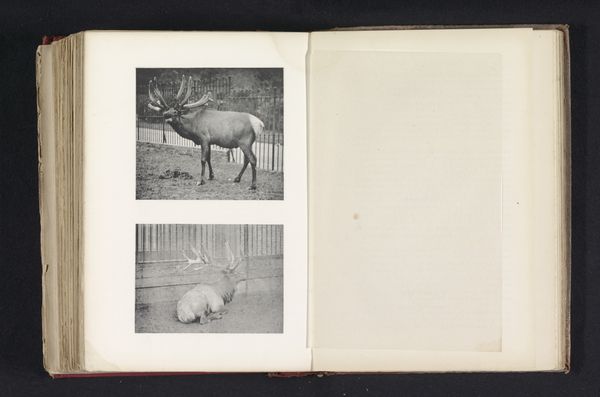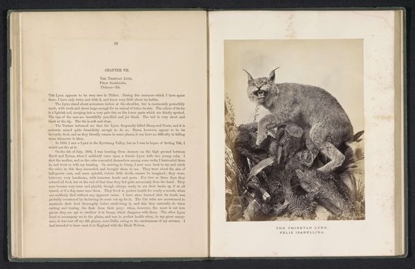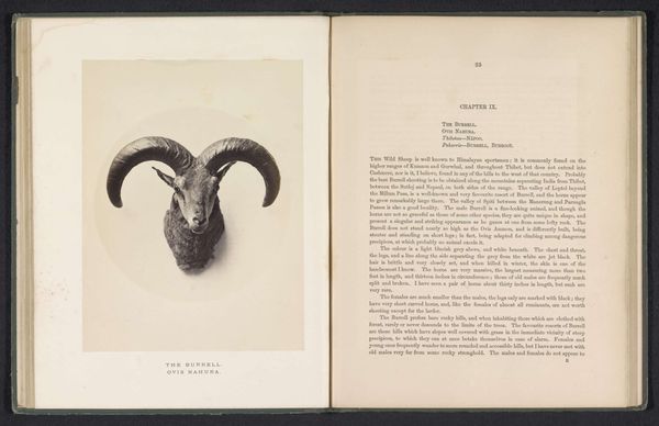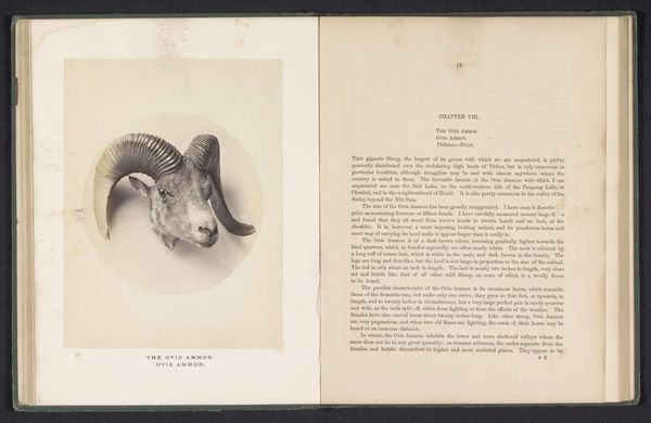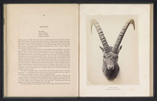 Editor: Here we have "The markhoor," a photograph by Arthur Lucas, dating from before 1869. The image shows the head and magnificent horns of a markhor, rendered in stark detail within the pages of an open book. It's incredibly striking, with those spiraling horns dominating the composition. What symbolic significance might this image carry? Curator: Indeed. The markhor itself has ancient symbolic resonance. Those impressive horns, spiraling upwards, echo motifs of ascension, growth, and even virility in many cultures. Consider, too, its association with mountainous regions; high places are often seen as sacred, linking earth and sky. Editor: That’s fascinating. So the horns act as a kind of visual metaphor? Curator: Precisely. They speak to an ambition, a reaching beyond the mundane. The photograph, though, also invites us to consider the colonial context in which it was produced. How might the act of photographing and documenting this animal within a book relate to themes of control, ownership, and perhaps even a sense of scientific dominance over the natural world? What emotions and historical narrative do those specific stylistic choices elicit for you? Editor: It adds a layer of complexity. It's not just a portrait of an animal; it's a statement about humanity's relationship with nature. There's something melancholy about it, though. Curator: I agree. Perhaps the animal embodies a vanishing world, and the photograph is an attempt to capture and preserve something already perceived as being lost, like cultural memory clinging to artifact. Editor: It's interesting how a seemingly straightforward image can hold so many layers of meaning. Curator: Indeed. The power of images lies in their capacity to evoke feelings and transmit ideas across time, linking us to the cultural anxieties and aspirations of previous eras. I’ve gained some insight through your sharp observations, as well. Thanks for joining me today!