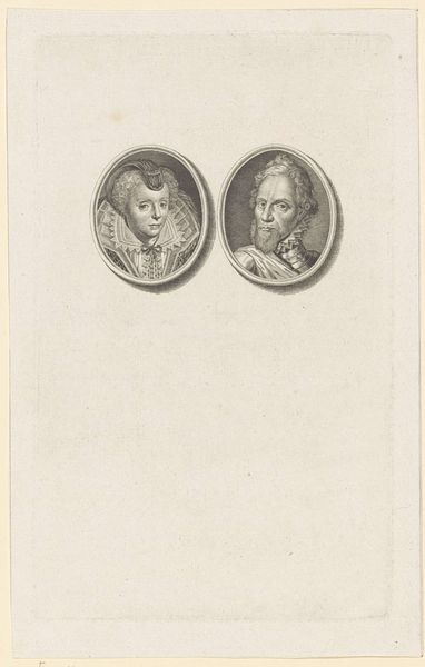 Curator: Welcome. Here we have “Bruyntje Springh-in ‘t-Bed en Flip de Duyvel,” an intriguing piece crafted sometime between 1612 and 1652 by Johannes or Lucas van Doetechum. It's currently housed right here at the Rijksmuseum. Editor: The composition immediately strikes me as incredibly formal, almost rigid in its symmetry. Two portraits, framed in ovals, facing forward... There’s a certain detachment to it. Curator: The title offers a clue. “Bruyntje Springh-in ‘t-Bed” roughly translates to “little brown girl jumping into bed,” while “Flip de Duyvel” means “Flip the Devil.” These aren’t just portraits, but rather types, figures embodying specific cultural anxieties. Editor: Yes, and I think the engraving style contributes to that sense of type rather than individual. The precise lines, the lack of dramatic shadow, it all feels very controlled and almost clinical in its execution. Curator: These images circulated widely, playing into prevailing stereotypes about people of African descent and feeding into the complexities of Dutch colonial narratives. It shows how visual culture was deployed to otherize groups of people based on their perceived traits, behaviors, and supposed connection to the infernal realm. Editor: Infernal realm, indeed. There's a disturbing undercurrent in this piece; these neat oval frames almost objectify the subjects further, transforming individuals into specimens for examination, specimens to be cataloged and categorized. Curator: Exactly, and remember that during the 17th century, the concept of "the other" was used to legitimize the enslavement and exploitation of African peoples, something of which, unfortunately, the Dutch participated greatly. This is but a symptom of that thinking made visual. Editor: While seemingly benign upon first viewing, closer consideration of the material qualities exposes a far more malignant historical narrative at work. The cool exactness masks a project of control, power and exploitation. Curator: A potent reminder that even seemingly simple portraits can carry a weighty legacy. Editor: Indeed, seeing how the very form itself is implicated in perpetuating such historical misrepresentation truly highlights how critical evaluation fosters dialogue of both the historical past and its effect on current thought.