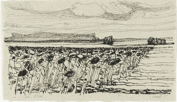 Jeannette Maxfield Lewis’s print, *Lettuce Workers*, presents a stark scene rendered through a dense network of etched lines. The composition is dominated by the figures of field workers, their forms bent and shadowed under the weight of labor. Above them, the sky churns with diagonal strokes, creating a sense of atmospheric pressure and unease. The artist employs a restricted tonal range, heightening the contrast between light and shadow to emphasize the workers’ physical exertion. The seemingly endless furrows draw the eye into the distance. We cannot deny the rhythmic repetition of shapes and the dynamic interplay between the figures and the landscape. Lewis masterfully uses the printmaking medium to evoke the harsh realities of agricultural labor. The formal rigor of the composition, where the repetitive tasks of the workers mirrors the repetitive lines of the printmaking process, reflects a deeper engagement with themes of labor, landscape, and the human condition. Notice how the structure challenges any romantic notions of rural work and life. Ultimately the artist compels us to consider our relationship to labor and the land.
