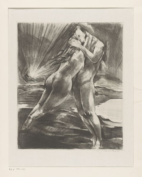 Curator: Standing before us is a sketch by Oluf Hartmann, titled “Modelstudie, foroverbøjet model set forfra”, created between 1901 and 1905. It resides here at the SMK. Editor: Oh, the slouch! Immediately I feel the weight of gravity and perhaps something more existential pulling that figure downwards. Is it me, or is there palpable melancholy in the strokes? Curator: It’s remarkable how he uses the pencil—a mix of light, almost hesitant lines, and then these sudden, dense patches of shading. It's not just anatomy; he's mapping form through light and shadow. I notice particularly the upper arm's muscularity contrasted with the obscured head. What is hidden versus what is revealed? Editor: It does seem a study of contrasts. Look at the subject’s stance—one arm obscuring the face, as if retreating inward, yet the body, powerfully built, appears on the verge of movement. It suggests inner conflict or maybe restrained potential. Also, the surface he stands upon seems both solid and ambiguous. It really invites contemplation. Curator: Hartmann has captured a moment suspended—it doesn't resolve, but keeps unfolding. What I mean is the form feels fleeting because of how visible the construction remains: look closely at the pencilwork still legible in the legs; it appears that he almost revels in exposing the drawing process itself. Editor: True, you see the hand of the artist everywhere; it’s like the ghost of other gestures beneath what we see on the surface, building dimensionality and depth, not just in a spatial sense, but also perhaps emotional layers? Ultimately, it is these exposed lines and deliberate shadows that suggest a story left untold. Curator: Hartmann's study is more than mere observation, right? He coaxes feeling out of form with minimal, chosen markings. Editor: Right—we’re not simply looking *at* a body, but perceiving vulnerability through it, its very raw depiction becomes profound.