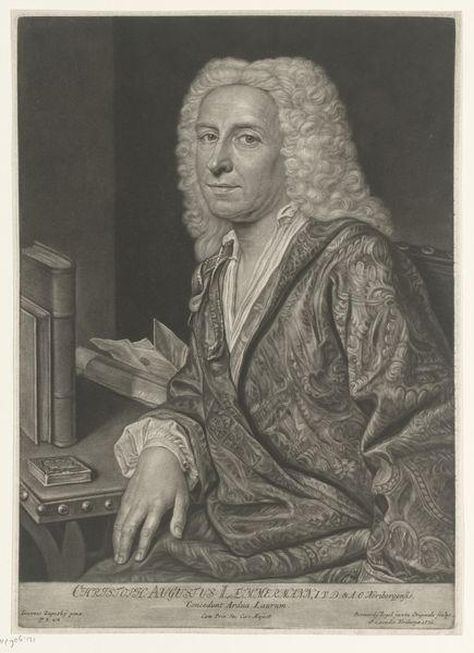 Curator: This is a portrait drawing from 1736, portraying Johann Andreas Bartels, rendered by Bernhard Vogel. Editor: There’s a cool sobriety to it, wouldn’t you say? That somber charcoal really lends weight to his gaze. Curator: Definitely. Considering Vogel’s mastery of draughtsmanship, it makes you wonder about the socio-economic position Bartels held that he was able to afford such a finely executed likeness. We see an intricate layering of clothing, a detail suggesting wealth and status. Editor: Right. And it also prompts us to reflect on visibility, particularly whose image gets circulated and preserved. What power dynamics are at play in commissioning and creating portraits like these? What social scripts governed the attire and presentation of men like Bartels? Curator: Interesting questions, particularly when you factor in that Vogel likely had a workshop, so labor and division of making would also be a crucial element in dissecting what this object is meant to convey. Think about it: charcoal, paper, tools, the dissemination of the final product and so on. How do these aspects solidify the artwork’s message? Editor: That coat just dominates. The quality and draping point to bourgeois confidence. Is it about more than material prosperity? Maybe an idealized depiction masking social tensions? I am sure Bartels' status could shield him from certain socio-political hardships during the Baroque era, when the stratification between social classes was rigid. Curator: Certainly food for thought! I keep returning to Vogel’s expert command of charcoal though, it is like he wanted to bring forth the very means of artmaking into our awareness. Editor: Yes! Thinking about art as a process, as a mode of social interaction, complicates our easy interpretations. A beautiful note to end on!