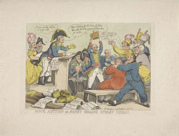 Editor: This is Thomas Rowlandson's "Road to Ruin," a print from around the late 18th century. It's... quite a scene! What do you see in the way Rowlandson depicts this apparent collapse of society? Curator: I see a direct commentary on the excesses of the Georgian era, focused on the material indulgence and social decay. Consider the printmaking process itself – a relatively accessible medium that allowed for the widespread dissemination of these satirical images. How does Rowlandson use this medium to critique the upper classes? Editor: So, the availability of prints enabled this social critique? Curator: Precisely! The means of production facilitated a democratization of commentary, challenging the established social order through visual representation and access. What do you think about that? Editor: Fascinating! I didn't think about the role of printmaking in enabling social critique like this. Curator: Indeed. Materiality shapes meaning, and Rowlandson's work is a prime example.