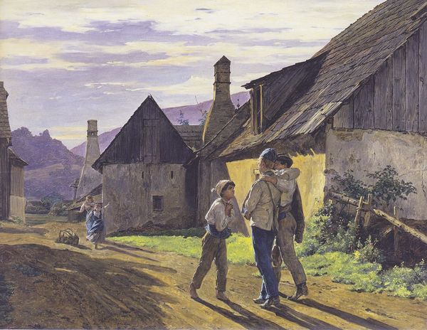 Editor: This is Winslow Homer's "On the Stile," created in 1878 using watercolor. The delicate brushstrokes give it a dreamy quality. I'm struck by the contrast between the young woman in her elegant dress and the rough, wooden fence. What feelings or ideas does it spark for you? Curator: Oh, this piece takes me back to simpler times, when stolen moments held such significance! Notice how Homer captures the fleeting connection between the figures; it's as if the rest of the world fades away. The loose washes of color evoke the hazy summer air. Have you ever felt that pull, where the boundary between what's wild and what's civilized blurs? Editor: I see what you mean. It's like they're on the threshold of something. Is it just innocent romance, or something more? Curator: Exactly! That tension is at the heart of it. It is typical Homer – he hints, but never tells. He uses color and form so expressively, doesn’t he? Do you see how the light catches her dress? Editor: Yes, that contrast is gorgeous. I thought it just added to the summery, impressionistic feel, but now I see that it gives the woman and their encounter a certain weight. It’s definitely more than *just* a snapshot of country life. Curator: It’s Homer observing, interpreting, feeling the pulse of life. And watercolor was perfect for this – translucent, immediate, capable of such nuanced emotion. He elevated it to a serious medium, didn't he? Editor: Absolutely. Seeing your perspective makes me appreciate how Homer uses a simple scene to evoke so many unspoken emotions. I’m ready to get out my brushes. Thanks for opening my eyes. Curator: The pleasure was all mine. Now go make your own magic with the world.