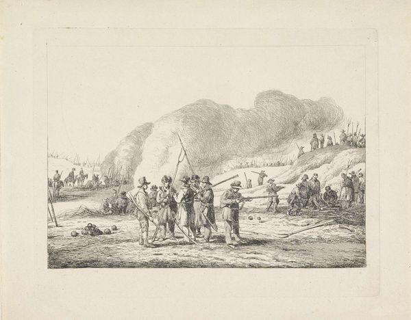Editor: This is "Hunting Party Letting Horses Drink at the Foot of a Bridge" by Jean Moyreau, likely made between 1733 and 1762. It's an engraving or drawing of a genre scene in a landscape. I find the composition interesting – what do you make of this artwork? Curator: From a materialist perspective, let’s consider the process of creating an engraving like this in the 18th century. Think of the artisan skill involved in creating the copper plate, the repetitive labor of etching, and the mechanics of the printing press to produce multiple copies. These were commodities, circulated and consumed. Who was buying them? What purpose did it serve to produce an image like this versus a painting? Editor: So, you are saying to think about this from the viewpoint of a commodity made by someone and consumed by others... It reminds me of a manufactured item that would serve certain social groups at the time. Is the depiction of this leisure class also significant? Curator: Exactly. What is the social context? What’s being represented and for whom? The image celebrates the leisurely activities of the elite, suggesting their control over both nature and resources. Who is missing? Consider what materials – copper, ink, paper – are used, their origins, and the economic systems enabling their availability. It wasn’t accidental but based on specific material relations. What kind of social role would this image serve for that privileged class? Editor: Right, so this image normalizes that class’ activities but only shows one very specific perspective. Focusing on its means of production, who might've been excluded during its consumption becomes more apparent, offering critical commentary on its themes. Curator: Precisely. We've touched upon how close looking at material reality lets us reflect on production, class, and historical circumstances. Editor: Yes, I will definitely look at art from the material aspects. Thank you!