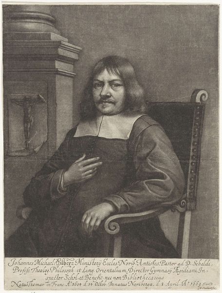 Editor: Here we have Jonas Suyderhoef's "Portret van René Descartes," dating somewhere between 1650 and 1675, an engraving, making it a print. The texture created by the engraving is really captivating, a dance of light and shadow. What strikes you most about the visual construction of this portrait? Curator: Formally, observe how the artist utilizes the contrast between light and shadow to sculpt Descartes's face and clothing. The strategic placement of highlights draws the eye to his intellectual features – the brow, the eyes. It is worth noting the density and variation of line work; they determine tonal values and create a tactile sense of depth despite the two-dimensionality of the medium. Notice the subtle diagonal created by the collar that brings a spatial dimension. Editor: It's true; that collar guides the eye. I'm curious, though – do you see any symbolism in the way he's posed, or in any particular compositional choices? Curator: I would suggest looking inward to the work’s compositional strength and visual language first, avoiding easy symbolic readings. The pose offers stability and a sense of quiet intellect through its symmetry and balance. The slight asymmetry that does occur only humanizes Descartes. The visual qualities offer an interplay between line and shadow, resulting in this rather powerful image. Does engaging with that influence your read? Editor: It does refocus it! So, the power lies not in hidden meanings, but in the manipulation of visual elements to convey an impression. Thank you, that’s enlightening! Curator: Indeed. By engaging with structure first, we perceive an artwork’s purpose and potential for greater insight.