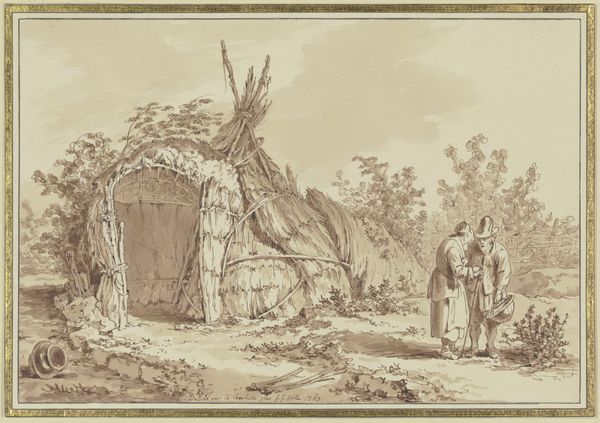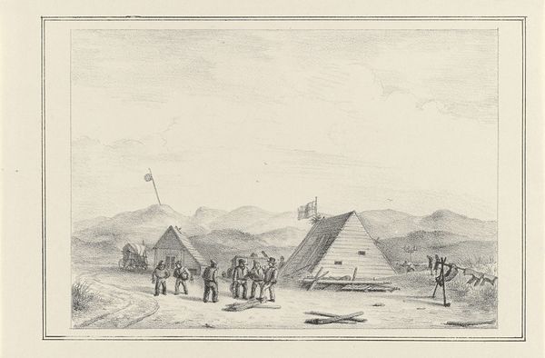 Editor: So, here we have "Family by a Shepherd's Hut," an engraving dating from 1822 to 1891 by Simon van den Berg. I'm really struck by the textures—you can almost feel the wool of the sheep and the rough fabric of the hut. How do you interpret this work through a formalist lens? Curator: Certainly. Let us consider the lines in this work. Note the strong diagonal lines that define the simple structure, juxtaposed with the soft, curvilinear forms of the figures and the flock. This tension between geometric form and organic shape creates a compelling visual rhythm. Do you notice how the artist employs hatching and cross-hatching? Editor: Yes, the hatching seems to give the figures their volume and solidity, contrasting with the more open, less defined background. It draws your eye right to the mother and child. Curator: Precisely. It is important to consider, too, the composition as a whole. The placement of the figures and hut creates a stable, almost pyramidal structure. How does this arrangement affect your perception of the family's place within the landscape? Editor: It gives them a sense of groundedness, a feeling of belonging to the environment, but also isolation, maybe? The empty space surrounding them emphasizes their separateness. Curator: An insightful point. Now, observe the values – the interplay of light and shadow. Where does the artist use contrast most effectively, and to what effect? Editor: Definitely around the figures. That contrast really brings them forward. Looking at the rest, the work does look to use a lot of muted tones. Curator: And what feeling is created in you? Is it joy? Or melancholy? Consider why Simon used so many of the subtle, light areas. Editor: I suppose, after breaking it down like that, there's an underlying serenity to the work. Even the starkness plays a part. I appreciate your insight into how these elements work together to create a very still image. Curator: And I admire your willingness to contemplate these components, such analysis is imperative for viewing more art to come.