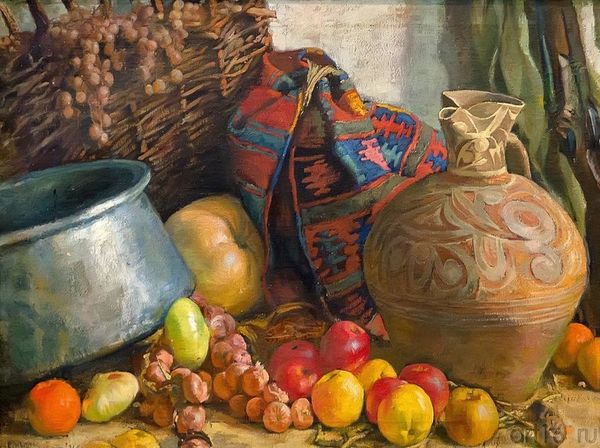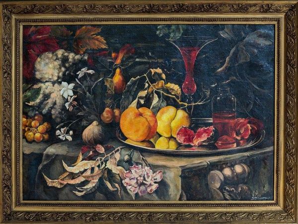 Editor: Here we have Lovis Corinth’s "Still Life with Flowers, Skull, and Oak Leaves," painted in 1915. There's a striking contrast between the vibrant colors of the fruit and flowers and the stark skull. What symbols do you notice in this still life? Curator: Well, immediately, the skull stands out. It's a powerful, timeless symbol, right? The skull whispers of mortality. Corinth is working within the ‘vanitas’ tradition. The wilting flowers, the ripening fruit, are these not also emblems of the transience of beauty and life? Editor: So, it’s a reminder of death through symbols of life? The ephemerality? Curator: Precisely. Consider the oak leaves, traditionally associated with strength and endurance. But are they vital and green? Or fading? Editor: Fading, definitely fading! Now, does the choice of using these strong, expressionistic brushstrokes contribute to that sense of decay or passing of time in any meaningful way? Curator: Absolutely. The impasto, thick application of paint, adds texture and immediacy, and heightens the emotional impact. It's not about precise representation, but about conveying feeling. A palpable sense of fleeting life is built in the application of paint itself! Editor: That makes a lot of sense, to build meaning with application. Thanks, seeing the traditional symbolism along with Corinth’s mark-making has deepened my appreciation for how ‘vanitas’ can come to life with paint. Curator: My pleasure. It is rewarding to think through how symbols endure over time.