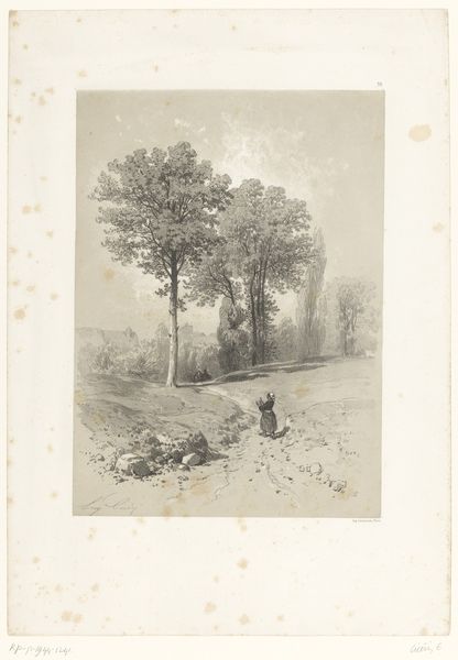 Editor: Here we have "Shipley Bridge, Devon, from Picturesque Selections," a lithograph drawing from 1859 by James Duffield Harding, currently held at The Art Institute of Chicago. It's striking how the texture created in the trees dominates the whole composition. What stands out to you when you view this piece? Curator: Indeed, the manipulation of line and form here is quite remarkable. Notice the almost scientific precision with which Harding renders the arboreal forms. The structural integrity of each branch, the layering of leaves – these aren't just aesthetic choices. They reveal a deep understanding of natural architecture. It transcends mere representation. What do you observe about the treatment of light and shadow? Editor: The contrast is dramatic. The light seems to spotlight the center tree, drawing the eye upward. Curator: Precisely. Observe how Harding uses the chiaroscuro to create a sense of depth. It’s not just about illuminating the subject, but about sculpting the visual space. The stark contrast emphasizes the physicality of the trees and creates a dynamic interplay between light and form, doesn't it? The diagonal line of the path guides us into the depth of the composition too. Do you feel there is a sense of movement or tension created by these contrasting elements? Editor: I see that. It feels active despite being a landscape. I hadn't noticed those choices before. Curator: By attending to the formal elements—the composition, the tonal gradations, and the carefully constructed space—we can understand this work not just as a landscape, but as a powerful statement about the inherent structural beauty of nature itself. It reminds us how Romanticism valued structure as much as expression. Editor: That definitely changes my perspective! I was so focused on the scenery, but seeing the structural intent makes the art more impactful. Curator: Focusing on the visual language allows a new understanding and deepens the aesthetic experience.
