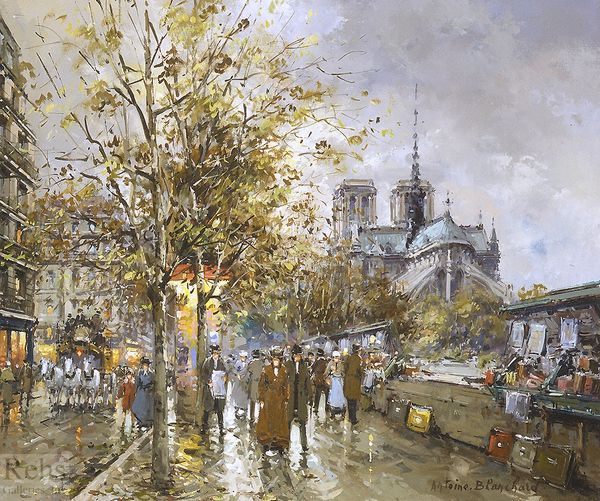Antoine Blanchard painted this view of Paris, likely in the mid-20th century, using oils on canvas. Blanchard engaged with the traditional, almost academic, style of painting, yet the application of the medium influences the appearance of the painting. The texture is loose, with visible brushstrokes that create a sense of movement and atmosphere. The weight and viscosity of the paint allow Blanchard to capture the light and reflections on the wet Parisian streets. The processes involved in creating this painting – from stretching the canvas to mixing the paints and applying them with a brush – connect it to a long tradition of easel painting, a practice deeply embedded in European cultural history. The social context of this work is interesting too. Blanchard mass-produced his paintings for the tourist market, reflecting the commodification of Parisian culture. Despite this commercial aspect, his skills and techniques remain evident, blurring the boundaries between fine art and craft. Ultimately, considering the materials, processes, and cultural context allows us to fully appreciate this artwork.
