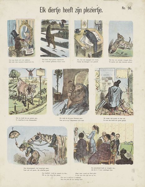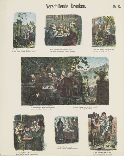 Editor: Today we are looking at "Uit de kinderwereld," which translates to "From the Children's World," created in 1874 by De Ruyter & Meijer. It's a watercolor print comprised of nine vignettes, each showing children in different scenes. The illustrations evoke a nostalgic, sentimental feeling, yet each has a different tone through the compositional framing and color saturation of each. How do you interpret this work through a Formalist lens? Curator: Well, looking purely at the composition, we see a deliberate, almost grid-like arrangement of these vignettes. The artists manipulate the frame of each rectangle as its own distinct and self-enclosed piece. Notice the interplay between the brighter, more vibrant scenes versus those that employ darker tonalities. Editor: Yes, the contrasts definitely create a rhythm for the eye as you view the piece. Curator: Exactly. And this rhythm is further reinforced by the variation in perspective, isn't it? Some vignettes present a close-up, intimate view, while others offer a wider perspective, emphasizing the children's relationship to their surroundings. Editor: It's like a visual poem where each stanza explores a different facet of childhood, with each scene a meditation on the use of line and color. I see it in how the darker shades set off the focal points. It's very strategic. Curator: Indeed. The interplay between these pictorial techniques elevates "Uit de kinderwereld" beyond mere illustration. The materiality of the watercolor as print lends a soft quality to each picture and an equal softness to each passing glimpse. Each segment carries the entire weight of the piece as its compositional support. Editor: Thinking about the aesthetic choices now makes it feel like less of a sentimental piece and more like a study of the very essence of what we call childhood. Curator: Precisely. A worthwhile distinction to be mindful of as we seek greater interpretive possibilities.