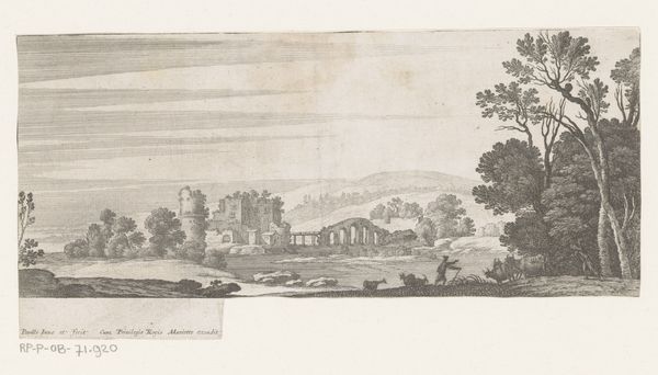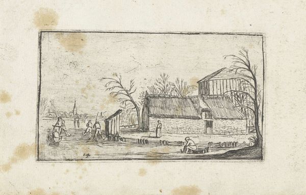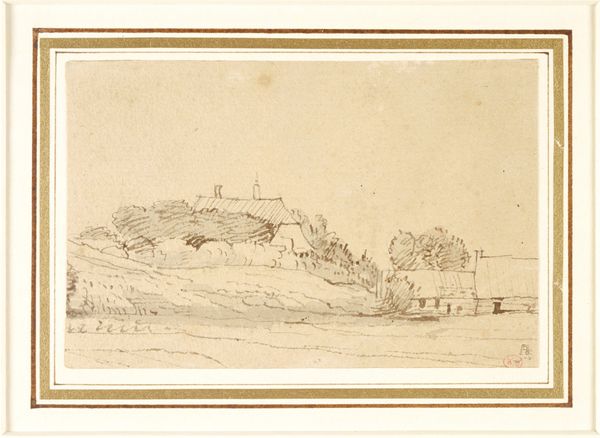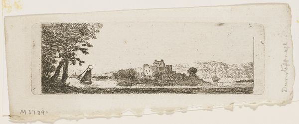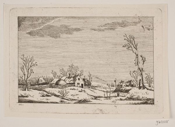 Editor: This small etching, "Trees and Buildings with Low Tower," by John Clerk of Eldin, feels incredibly intimate. The landscape, rendered in such fine lines, gives it a quiet, almost secretive mood. What formal elements stand out to you the most? Curator: The most striking aspect is the interplay between the dense, almost impenetrable darkness of the trees on the left, and the relatively open space occupied by the buildings on the right. Consider how the artist employs hatching and cross-hatching to build up tonal variations, especially within the foliage, which creates a complex visual texture. How does this compare to the relative simplicity of the sky and the more geometric forms of the buildings? Editor: It almost feels like two separate images joined together. The contrast you point out is really strong. I wonder why the artist chose such different treatments for the different elements. Curator: Precisely. The composition appears bifurcated. It raises questions about the artist's intentions. Is it simply a rendering of a scene, or does the arrangement speak to a deeper formal consideration of balance and contrast? The lack of a clear focal point also contributes to this sense of ambiguity. Does it suggest an exploration of differing textures, shadow and light, or structural organization within the natural world, that are echoed in the constructed one? Editor: I see what you mean. It's not just a landscape, it’s an exploration of contrasting textures and compositional techniques. It almost feels like a study in visual contrasts. Thank you! Curator: Indeed, it provokes contemplation beyond its mere representational qualities. I’m glad we had this chance to analyze it together.