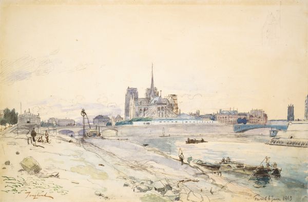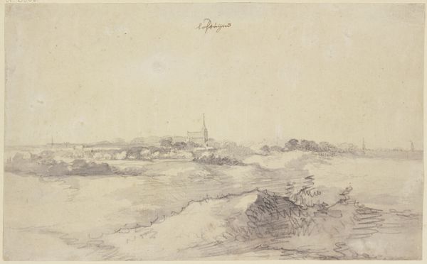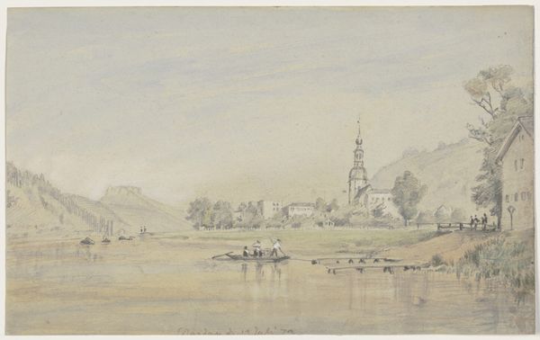 Editor: Right now we are looking at "Landschap met kerk", or "Landscape with Church," a watercolor piece dating from sometime between 1823 and 1876, by Salomon Leonardus Verveer. It feels…almost desolate, doesn’t it? A muted color palette, a lone figure wading through water. What do you make of this scene? Curator: Desolate, yes, but perhaps also… contemplative? It whispers rather than shouts, doesn’t it? Verveer really captures that feeling of Romanticism, that slightly melancholic but beautiful embrace of nature. Look how the church spire pierces the sky, a symbol of steadfastness against the ever-changing landscape. Does that steadiness mean anything to you? Editor: I suppose I hadn’t thought about the church as a counterpoint to the… transience of everything else. So, it's less about complete desolation and more about finding a sense of peace, maybe even hope, within a subdued landscape? Curator: Precisely! It's a gentle nudge, really, a reminder that even amidst a potentially bleak outlook, elements of stability and hope—like that stoic church—can always be found. It's about finding beauty in the quiet moments. What feelings resonate with you, then? Editor: Well, thinking about the church now, I see it less as desolate and more... grounding? And, I see what you mean by embracing nature in a beautiful way; not in a bombastic, colorful sense, but as quiet beauty. Curator: Yes! Quiet beauty is right. Perhaps that is what Verveer tried to offer us all along; a serene haven amid the ceaseless flux. A reminder of enduring strength found in simple forms. Editor: This was a new and surprising point of view. I like the sense of hope in the romantic scenery, rather than hopelessness. Thanks so much!