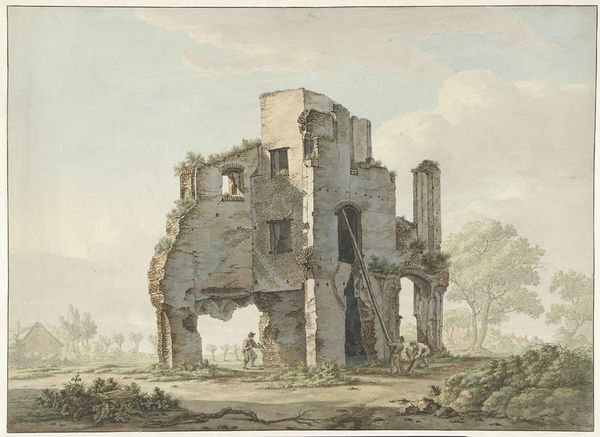 Curator: It feels like a memory half-recalled. There's a dreaminess to Girtin's "The Kitchen at Stanton Harcourt, Oxfordshire," with its faded hues and softly blurred edges. Editor: What strikes me is how this watercolour, despite its delicate rendering, presents a clear illustration of labor and construction. Look at the figures hauling timbers. Curator: True, but it's more than just documentation, isn't it? The colour palette, those muted blues and browns, evokes a sense of quiet melancholy. Editor: Maybe, but Girtin's hand here reveals the realities of building. The Kitchen isn't just a romantic ruin; it’s a site of industry, of bodies shaping materials. Curator: Perhaps he sought to capture the essence of a place in flux, between grandeur and decay, permanence and transience. Editor: And his choice of watercolour allows for a portable, reproducible image—a democratization of landscape, if you will. Curator: A point well-made; this little watercolor opens up many windows into history. Editor: Indeed. It's a small window, but one that frames a rather large perspective on the social landscape of its time.