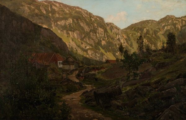 "Fra Stalheim" is a landscape painted by Amaldus Nielsen. Nielsen was a Norwegian realist painter, whose lifetime coincided with a period of significant social and political change in Norway, including growing nationalism and industrialization. Here, Nielsen captures the vastness of the Norwegian landscape, but also includes small details of human presence—a road, a village—that speaks to the relationship between the individual and their environment. The image evokes the sublime, a popular theme in the art and literature of the time, reflecting a sense of awe and insignificance in the face of nature’s grandeur. There is a romanticization of rural life, which was a common sentiment during a time when many people were moving from rural areas to cities in search of work. The play of light and shadow across the mountains creates a sense of depth and mystery, inviting viewers to reflect on their place within the world, as the sublime power of nature reshapes our social and cultural identities.