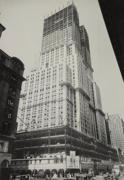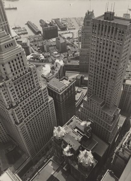 Curator: Berenice Abbott's black and white photograph, "St. Bartholomew's Church, Waldorf-Astoria Hotel, and General Electric Building," created in February 1936, offers a fascinating juxtaposition of old and new architectural styles in New York City. Editor: Wow, my first thought? It's kind of oppressive, in a beautiful way. Like these stone giants are looming, but the light softens the edge a bit. Does that make sense? Curator: It does. Abbott’s sharp focus emphasizes the scale and texture of these buildings, capturing the tension between the spiritual, represented by the church, and the capitalist, represented by the hotel and General Electric building. The Great Depression was in full swing at this time. These imposing skyscrapers embody power and progress but also social disparity. Editor: Yeah, I feel that disparity, staring right up. It's not just physical, is it? I'm thinking about power dynamics here. It looks like even God needs some corporate scaffolding in this city. Curator: Precisely. Abbott was deeply interested in the urban landscape and social dynamics. The architectural forms are stand-ins for social commentary. Notice the choice of perspective—a deliberate positioning to spark that dialogue between these institutions and question their relationship. The church looks almost quaint compared to the looming skyscrapers. Editor: Right, quaint! Like a little mushroom under the shade of giants. There's almost a cheeky irony to it, wouldn't you say? She is highlighting that asymmetry so intentionally, it's practically begging for interpretation. What do you make of the sky and light in the image? Curator: The almost ethereal sky serves as a stark background. The contrasting dark tones of the structures amplify their impact. She aimed to use the precisionist style to document New York's changing urban environment, using architecture as a proxy for social changes during this period. Editor: I guess looking at it all, the beauty of the geometric forms and gradations really makes it easier to ponder the serious underlying themes. Thanks to Abbot for inviting me on the path, I almost feel like a little building myself. Curator: That's well put. Abbott's work remains relevant precisely because she documented more than just buildings; she captured a particular historical moment and the socio-political forces shaping it.