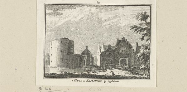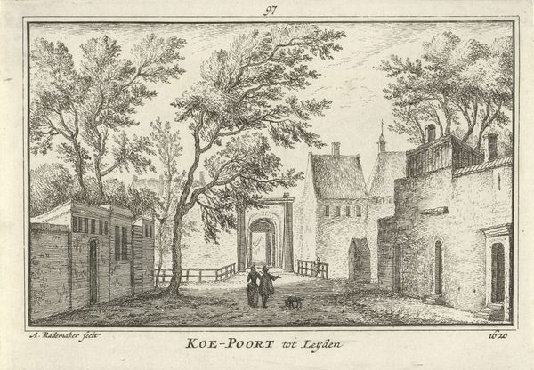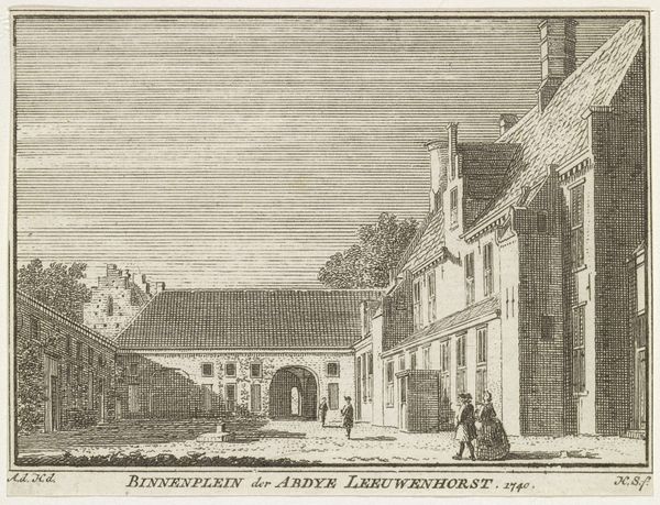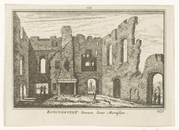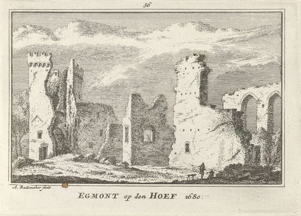 Curator: This detailed etching is titled "Sint Maartenskapel te Nijmegen," dating back to the period of 1727 to 1733 and crafted by Abraham Rademaker. It now resides in the Rijksmuseum collection. Editor: My initial impression is one of quietude, despite the architectural grandeur depicted. The muted tones and careful linework evoke a sense of timeless observation, as if capturing a moment in a dream. Curator: Precisely. Rademaker's expert manipulation of line weight creates depth, pulling the eye through the composition. Notice the calculated contrast between the crumbling ruin on the left and the more intact Romanesque chapel to the right. It introduces an almost narrative juxtaposition. Editor: Yes, and that ruin holds a powerful symbolic weight. The juxtaposition of decay and persisting faith – literally the chapel – reflects enduring spiritual themes and possibly alludes to cultural memory embedded in these spaces. One sees, perhaps, resilience. Curator: I concur. Consider the use of light and shadow here, as well. The areas of deeper shadow subtly delineate form. Structurally, the lines themselves, etched with such precision, demonstrate command over materials, offering visual information in calculated doses. Editor: The inclusion of the figures, though small, contextualizes the chapel's presence and emphasizes how people imbued the place with meaning and animated the space with secular, not only religious, practices. It provides an enduring representation. Curator: Agreed. Rademaker provides insight to us through compositional methods. This Dutch Golden Age scene serves less as literal representation and more of structured visual argument. Editor: Yes. Rademaker's work not only represents physical buildings, but transmits enduring symbolic language. We decode time, ruin, enduring structures through visual metaphors in his image. Curator: Precisely. Through masterful formal considerations, he achieved an etching full of complexity, balance and lasting commentary. Editor: A masterful portrayal rich in historical, cultural and personal perspectives, preserved within a single frame of existence.
