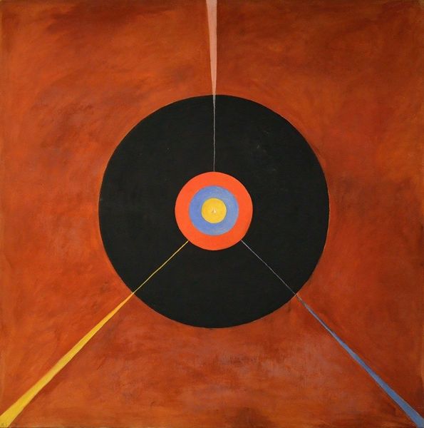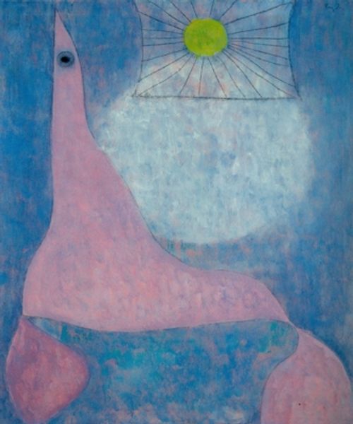This untitled painting was created by Jagdish Swaminathan, an artist who was active in India throughout the second half of the twentieth century. It features a minimal arrangement of color blocks, and floating symbols in the sky. Swaminathan was a member of Group 1890, a collective that sought to challenge the dominance of the Bombay Progressive Artists' Group, which they felt were too Eurocentric in their outlook. The group's name referred to the address where they first met, and also alluded to the numerous revolutions that had taken place in Europe during the 19th century, suggesting their ambition to provoke similar social change. The symbols in Swaminathan's paintings borrow from tribal art, and his practice represented an attempt to move away from Western academic styles. His work is self-consciously progressive and critiques the art institutions of his time. To understand Swaminathan's place in the development of Indian modernism, it is important to look at manifestos, exhibition catalogs, and critical reviews from the period. By focusing on the social and institutional context of the artist's work, we can arrive at a deeper understanding of its meaning and significance.