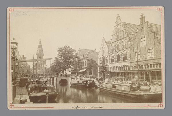 Curator: This is a photograph titled "Straatgezicht met de Waag en de toren van het stadhuis te Leiden" by Hendrik Jonker, dating between 1882 and 1914. It’s a gelatin silver print capturing a serene cityscape. Editor: My initial impression is a sense of quiet dignity. The composition feels very grounded, almost stoic, in its presentation of this Dutch city. There's a certain timelessness in its grayscales. Curator: Indeed. The gelatin silver print is known for its ability to capture a wide range of tones and sharp details, crucial for recording the intricate brickwork and architectural features. The photograph uses this clarity to imbue Leiden's landmarks with historical weight. Notice how the image positions the Waag, or Weigh House, along with the City Hall tower to symbolize civic authority and mercantile exchange. Editor: It’s also fascinating how the daily life—the figures on the boat, the implied presence of commerce—is interwoven with those symbols of power. What does this relationship communicate about Dutch society at the turn of the century? Are these structures in the service of these anonymous labourers? The way Jonker layers social narrative is intriguing. Curator: You are drawn to a wider view—I tend to observe symbolic meanings. Consider that water, always shifting yet also a constant element, can embody not only commercial flow but the unconscious flow of tradition, history, memory and community identity. Editor: I’m with you there, though it also makes me consider what *isn't* shown. How might the image feel different if the subjects in the foreground were clearly wealthy, powerful figures? What kind of political and socioeconomic relationships are at play within that composition? Curator: What intrigues me as well are all of the tiny windows along the buildings—each suggesting a life. Do you think that Jonker deliberately arranged to capture only glimpses? It could represent an objective vision where each part contributes toward the complete experience of that moment in time. Editor: Ultimately, I find the print a compelling historical artifact and how it encourages conversation between tradition and transformation, between power structures and ordinary citizens. Curator: And as such it allows for considering our society’s continuity, its changing character and visual traces of ourselves from prior generations.