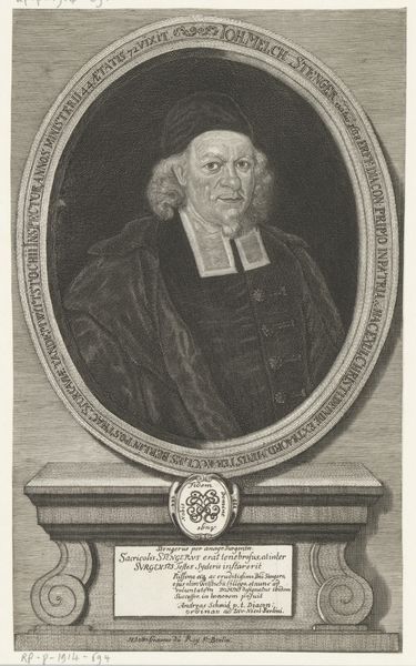 Editor: This is "Portret van David Gottfried Schwertner," an engraving made in 1734 by Johann Tscherning, currently held in the Rijksmuseum. It feels very…official. Stern, even. That oval frame, the precise lines… it's impressive, but what more can you say about it? What do you see in it? Curator: I see a window into a world where identity was carefully constructed and presented. Look at the *line* of it all—that almost painfully meticulous detailing! But then let your gaze soften, blur your vision a little...doesn’t the sitter's gaze hold something unexpected? Something almost vulnerable? I wonder what stories were held in confidence within his world... Does it evoke that feeling for you as well? Editor: Vulnerable? I hadn’t thought of that. I was so caught up in the… Baroque-ness, I guess. It's interesting that you focus on vulnerability! Maybe it's his eyes, but they really do look softer now that I think about it. What are we looking at beneath that seriousness? Curator: Exactly! This print isn't just about status, though of course, the trappings of power and respect are certainly there. It’s about capturing a presence, about the dialogue between public persona and inner life. The choice of an engraving adds an extra layer, I believe. Tscherning uses the medium, usually designed to exactly repeat images en masse, to capture a moment of deeply individual being. So do you still think this feels stiff, or could it be seen as more profound and nuanced in your mind? Editor: I'm definitely reconsidering it now. It's funny, you look past the obvious symbols of power and, well, there he is, staring back at us. Thanks to this conversation, I'll see the person hiding beneath what at first sight appeared just a rigid Baroque official image. Curator: Exactly, our perception is just that, OURS, in each viewing it is ever-changing!