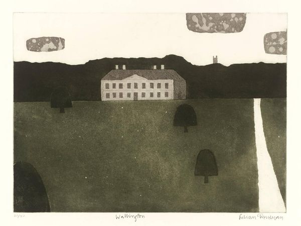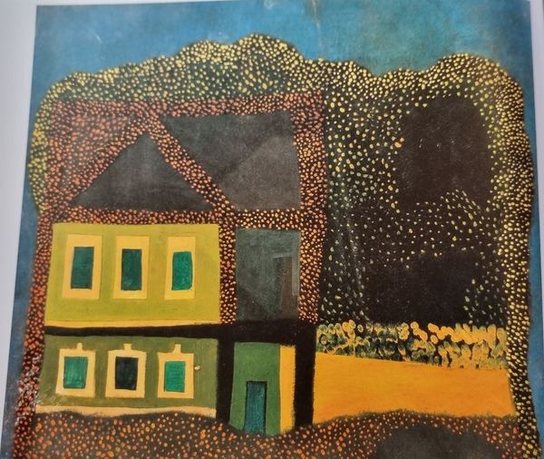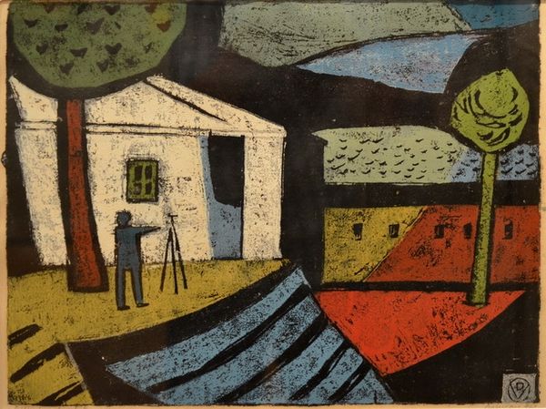Curator: Here we have Vajda Lajos’s "Spotty House," a mixed-media piece from 1936. Editor: My initial impression is this is unsettling, almost oppressive. The dark palette and enclosed space… Curator: The overall composition, a relatively flattened facade, does close in on itself, doesn't it? I see that sense of compression operating structurally. The way Vajda Lajos overlays geometric forms gives it an almost claustrophobic quality. It could evoke a sense of urban isolation perhaps. Editor: Urban is a generous word, at least from my viewpoint. What grabs me here are the mixed media elements – especially what looks like paint – used to create this pattern. The systematic labor behind each spot creates texture but it simultaneously obliterates the space. Curator: I note your focus on labor; interesting to approach from a materialist point of view. From a formalist point of view I'm drawn to the repetitive patterns. The artist does appear fixated with spots framing the structure. Editor: True. Look at the spots. Is the application deliberate? The accumulation feels significant. Are we looking at decay or disguise? I'm drawn to what seems to be an attempt to redefine value – repurposing cheap media to make art. Curator: An Expressionist painting like this makes those kinds of questions about subjective response important, I think. It uses basic geometry, repeated motifs, to represent its inner psychological space, which it does seem to imbue with feelings of alienation. Editor: Which really connects the form of it with its historical circumstances, given the rise of urban centers. These sorts of visual choices, from material usage to structural design, speak to a world undergoing massive transformation, and maybe, a sort of decay in craft due to industrialization? Curator: An interesting observation, how the exterior form is influenced by a period of political turbulence and unease that seeped in through visual motifs, but is further heightened through color theory; for example, the high-keyed acid greens make the architecture read artificial. Editor: I find myself respecting it for not flinching away from the harsh realities of existence. An exploration of the labor to build art. Curator: Agreed. The artwork lingers with you long after you have passed by; a testimony of material presence and the impact of expressionist form.
