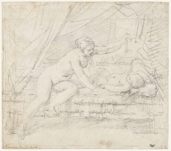 Curator: Here we have a fascinating drawing by Moritz von Schwind from around 1847, entitled "Personification of the Rivers Neckar and Main in the Rhine Picture as Half-Nudes." It’s a pencil drawing housed right here at the Städel Museum. Editor: It strikes me as so...unfinished. Ethereal, almost. The figures seem to emerge from the paper itself, giving it a dreamlike quality. A bit Romantic. Curator: Indeed! Von Schwind was a major figure in the Romantic movement. This piece is likely a preliminary sketch, providing insight into his artistic process and how he conceptualized allegorical representations of German rivers. The half-nudes, of course, are a classical reference point for representing these natural entities. But look at how they're posed, turning away from each other and towards the distance. What do you make of this arrangement? Editor: It highlights the power dynamics inherent in how we depict the landscape and its resources. Who gets represented? In what ways? The almost academic depiction of the figures contrasts with what isn't being shown...the context within the industrialization period they were surely heading towards. It points to a visual rhetoric, romanticizing nature while exploitation rapidly advances. What were Schwind’s other interests in creating this drawing? Curator: Well, Schwind was very much a part of a nationalist artistic movement in Germany. These rivers weren't simply geographic features; they were imbued with symbolic weight connected to the unification of the nation, ideas around homeland and heritage. So his idealized vision reinforces the narratives that served those political aspirations. Editor: Absolutely, and understanding this larger socio-political landscape helps us contextualize these romantic visions of nature. Art rarely exists in a vacuum, does it? It often actively shapes or responds to the narratives of the time. Curator: Exactly. This sketch invites us to investigate the complex ways in which national identity and nature are interwoven in the 19th century visual imagination. Editor: It truly shows us the important ties to the art from any particular time and the artist’s intent. Thank you for this amazing discussion.