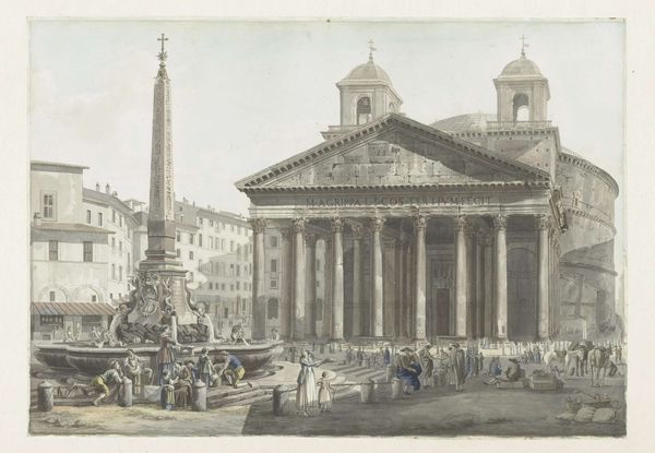 Editor: This painting, titled "View of the Pantheon, Rome," is an oil painting attributed to Ippolito Caffi. What strikes me most is the sheer density of the architectural details; it's almost overwhelming. How do you interpret this work? Curator: For me, this isn't simply a picturesque cityscape; it's a commentary on power and its visual manifestation. The Pantheon, a structure repurposed over centuries, stands as a symbol of evolving authority, from Roman gods to the Catholic Church. Do you notice how the everyday life of the people almost fades into the background against this powerful structure? Editor: Yes, now that you mention it, they do seem small and almost insignificant compared to the grandeur of the architecture. So, you're saying that the painting invites us to consider the relationship between individual lives and the institutions that shape them? Curator: Precisely! The architectural dominance serves as a constant reminder of the systems at play. We might also ask ourselves, who has access to these spaces, both physically and symbolically? The architecture and the institutions both shape the narrative and lived experience. How does this perspective shift your initial reading of the "density" you mentioned? Editor: It reframes it completely. It’s not just about detail, it is more about this visual representation of the established authority influencing every little aspect of the scene. I will never be able to see cityscapes without this framework again! Curator: And that's the point, isn't it? To encourage a more critical viewing of art and its relation to the broader political, cultural, and social landscape, always. Editor: Exactly!