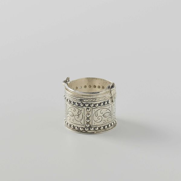 Curator: Here we have a "Trencher Salt," dating from about 1730 to 1735, created by Jacob Ten Eyck. It's crafted from silver and embodies the decorative art style of the Baroque era. What's your initial impression? Editor: It's a funny little thing, isn't it? Tiny and delicate, almost precious. It reminds me of a miniature fortress for a grain of salt, perched and waiting. Curator: That's an intriguing way to put it. Think about its placement – on the table, near your trencher, a shared plate. This isn't your solitary sprinkle from a shaker; it’s a communal vessel. A small, elegant way of saying, "let's eat together." Editor: "Elegant" is the word. The tiny pierced details – the material has been deliberately carved, so to speak – hint at a society that valued refinement. This wasn’t just about flavor; it was about presentation. And consider the labor involved, the silversmith patiently making such a small thing beautiful. Curator: Exactly! There is an element of conspicuous craftsmanship here. Baroque loves the flourish, and even on such a humble item, there's that dedication to detail, as you say. It makes me wonder about the people who used it, their rituals, the gleam of candlelight on this silver surface during a meal. The artist gives value to a grain of salt. Editor: I’m thinking about the sourcing of silver then, its circulation, and the labor exploitation often attached to luxury objects from that time. A beautiful thing fashioned for sharing… and consumption. Curator: A bittersweet symphony of taste, then? It's remarkable how a simple vessel like this can evoke such layered contemplations. Editor: Indeed. It really drives home the point that everything, even our dining customs, carries its own material weight and history. Curator: Ultimately, it offers us a connection to past lives through this precious yet simple vessel.