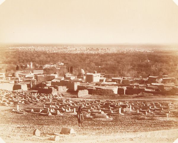 Curator: This albumen print, titled "Marseille," was created between 1856 and 1860 by Édouard Baldus. Editor: It evokes such a stillness, a muted calm over a busy port city. The repetition of the rectangular bales stacked and loaded is striking. Curator: Baldus was commissioned to document France’s infrastructure developments, especially those tied to industrial progress and its relationship to trade. So, here, the aesthetic presentation intersects neatly with the politics of nation-building and power. Note how the low vantage point seems almost designed to make the landscape recede and diminish—subordinate it to the industrial activity in the foreground. Editor: The geometric structures created by the stacked goods impose order. The sepia tones lend the whole scene a formality, but also unify the different visual elements. The textures too, despite their repetition, carry so much complexity when observed up close, wouldn't you say? Curator: Indeed. And it’s this supposed realism that is so fascinating, right? It's tempting to interpret it as simple documentary, but there's no objective lens. We are witnessing the selective framing and construction of a narrative around industrial might. Think of who controlled these new resources and who had access to global trade and power! It forces us to ask what perspectives are subtly excluded in this idealized view. Editor: I find the play of light especially compelling. It draws the eye toward specific areas while other portions melt away in shadow, leaving details obscured to emphasize shape and tonality over clear legibility. It seems to me that there's a dialogue between chaos and control throughout the composition. Curator: This makes one appreciate the photographer's attempt to show development in a new world. We must analyze how the rapid reshaping of Marseille in the 19th Century affected society. Editor: A compelling view, emphasizing form.