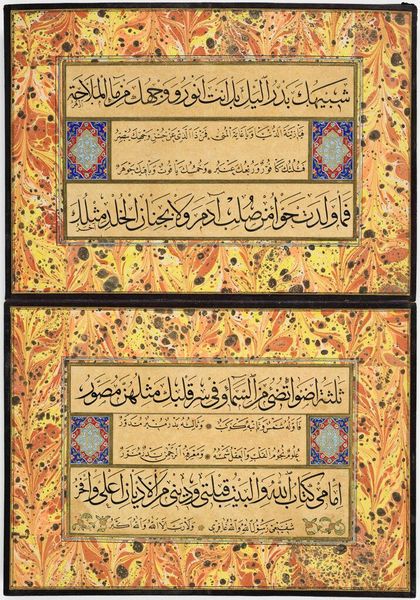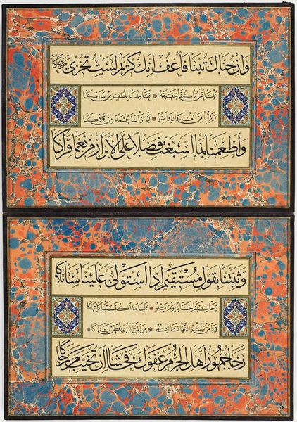 Curator: Here we have a bifolio—that's two pages—from an album of calligraphic exercises. The scribe is listed as Al-Hajj al-'Arif, though we have no dates for him. Editor: It's mesmerizing. The contrast between the rigidity of the script and the marbled border is quite striking. The texture of the paper itself seems almost fluid. Curator: Indeed. Calligraphy, especially in this Islamic context, is more than just writing. It's a visual embodiment of sacred words, a spiritual practice made manifest through laborious craft. Editor: I'm thinking about the labor involved in creating both the calligraphy and that incredible marbled paper. It speaks to the value placed on skill and dedication. Curator: Absolutely. And the text, while indecipherable to many of us today, would have resonated deeply with its intended audience, evoking a sense of reverence and cultural identity. Editor: This is a testament to the power of artistry intertwined with religious and cultural meaning, rendered in tangible form. Curator: A poignant reminder of how art can bridge temporal and spiritual divides.
