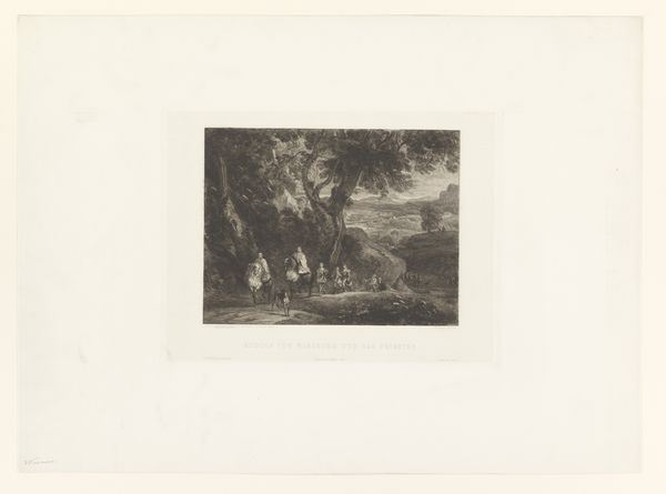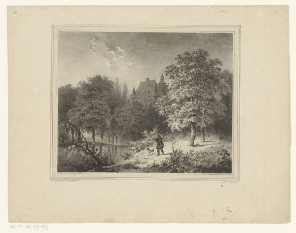 Editor: Here we have "Schaapskooi bij brug", or "Sheepfold by a Bridge," an etching by François Joseph (II) Pfeiffer, dating from sometime between 1809 and 1835. It feels quite delicate and still, like a captured memory. What do you see in this piece? Curator: Oh, it whisks me right back to a simpler time! There's a distinct lack of the hyper-real; the sketchy lines lend it a certain dreaminess. Notice how the bridge and building offer a sense of groundedness? Like two voices in conversation! Have you ever considered the power of suggestion in landscape art like this? Editor: I hadn't really, I was mainly focused on the composition itself, like how the trees kind of frame the sheep and the figure. But what do you mean, "the power of suggestion"? Curator: Well, Pfeiffer isn't giving us every single detail. The etching allows our imagination to fill in the gaps, to feel the cool dampness of the stream, or hear the distant bleating of sheep! It's less about the 'what' and more about the 'what if,' you know? What do you suppose that figure is doing on the bridge? Editor: Maybe just moving the sheep to new pasture? It does seem quite a serene little journey! Curator: Precisely! Art's not just a pretty picture; it's a portal. And a bit of quiet pondering does everyone good. Editor: This etching is more than meets the eye. I feel like I have more appreciation of these genre painting. Thanks for helping me reflect! Curator: The pleasure's all mine! Now you know the value of letting your imagination lead the way. On to the next adventure, then?